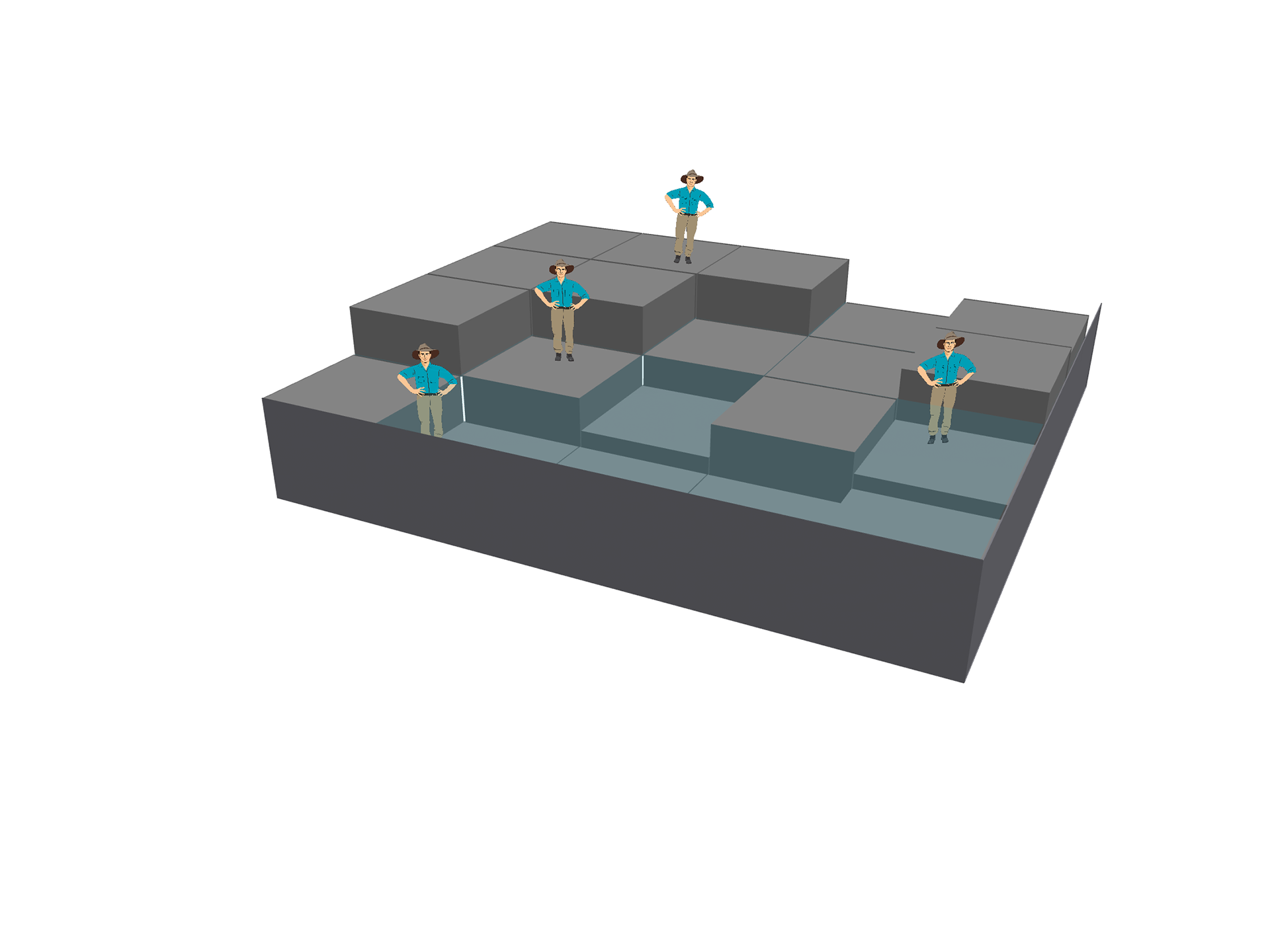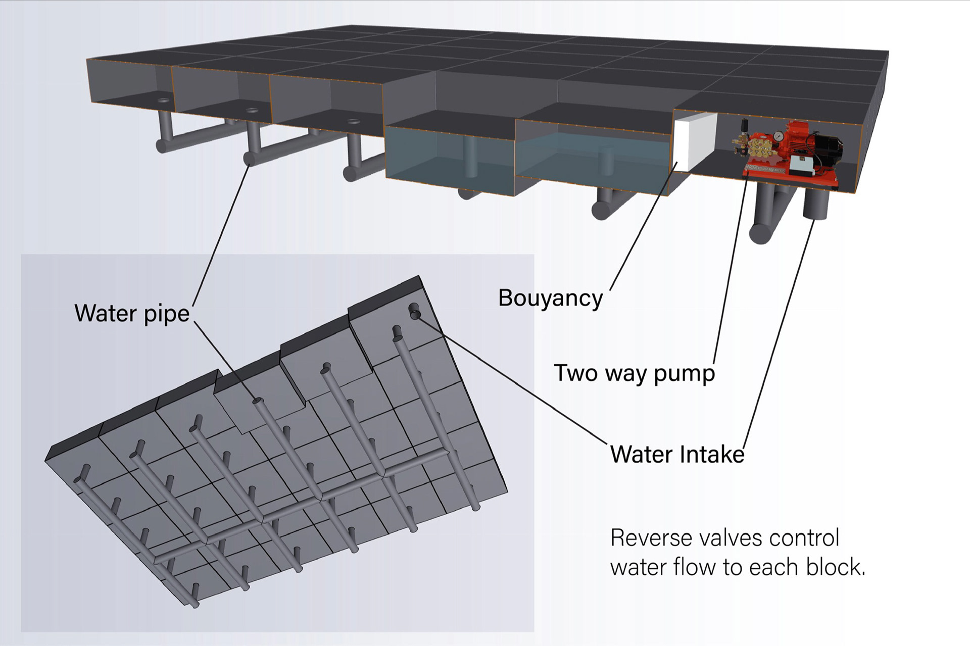 This stage with individual blocks, hydraulically controlled to sink down and rise up, brings awareness of sea level changes to first world audiences.